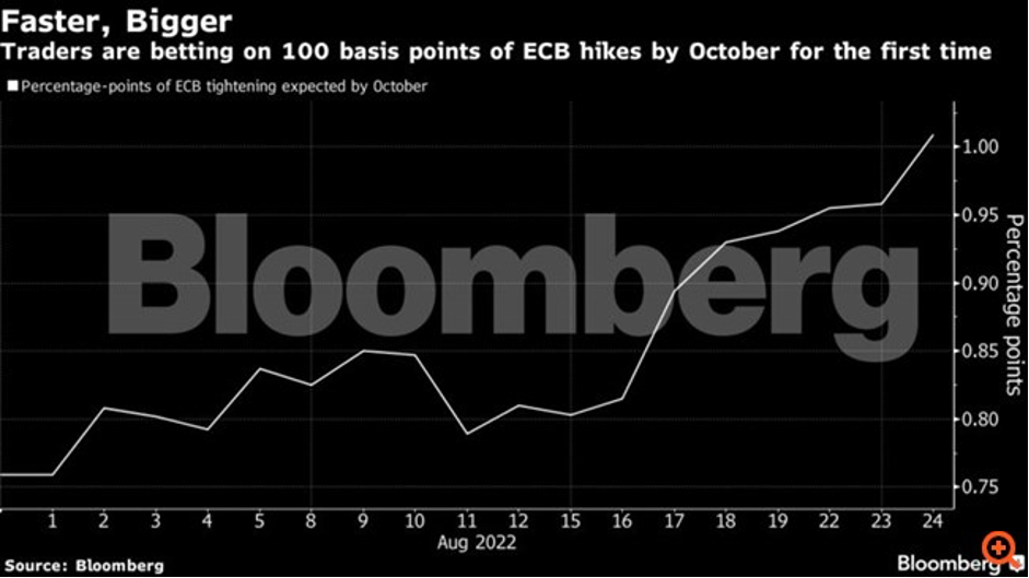 Οι traders αυξάνουν τα πονταρίσματα ότι η Ευρωπαϊκή Κεντρική Τράπεζα θα καταφύγει σε πιο επιθετικά μέτρα για να τιθασεύσει τον πληθωρισμό, καθώς η ευρωζώνη βρίσκεται αντιμέτωπη με τιμές ρεκόρ στην ενέργεια μετά τον πόλεμο της Ρωσίας στην Ουκρανία.