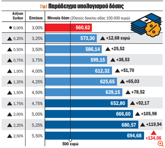 Κατά 50 ευρώ αυξάνεται η δόση του στεγαστικού δανείου που πληρώνουν τα νοικοκυριά για κάθε αύξηση του Euribor κατά μία ποσοστιαία μονάδα, όπως φαίνεται στον παρακάτω πίνακα. Όσο πιο πρόσφατο είναι το δάνειο, τόσο περισσότερο επιβαρύνεται ο οφειλέτης, αφού τα στεγαστικά δάνεια προτεραιοποιούν τις αποπληρωμές τόκων, με το κεφάλαιο να εξοφλείται τελευταίο.