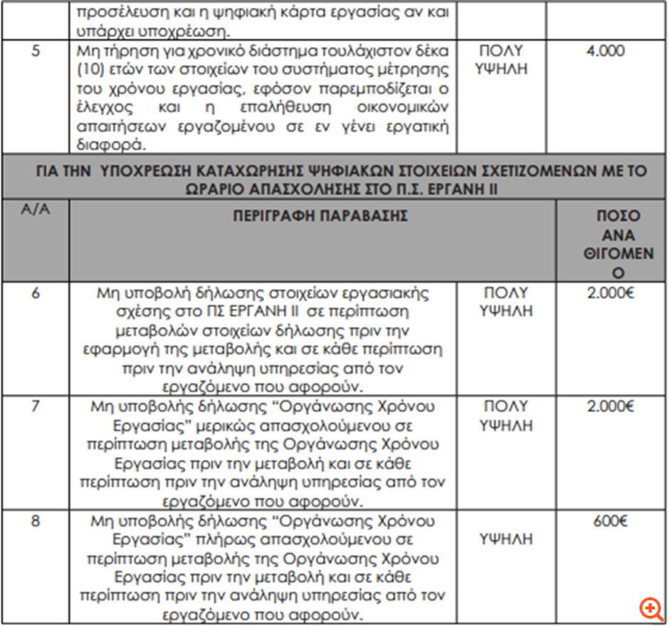 Επίσης, για κάθε περίπτωση απόκλισης της καταγραφής του χρόνου εργασίας από τον πραγματικό χρόνο εργασίας επιβάλλεται πρόστιμο 3.000 ευρώ. Εάν ο εργοδότης παρεμποδίζει την απόδειξη του πραγματικού χρόνου εργασίας, εξαλείφοντας τα στοιχεία, το πρόστιμο είναι 4.000 ευρώ.