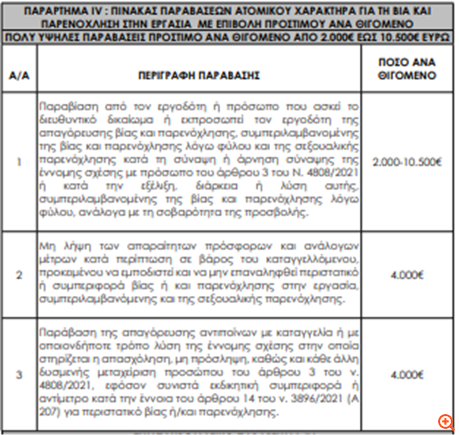 – Στα κατασταλτικά, όταν δηλαδή υπάρξει περιστατικό παραβίασης, οπότε, αναλόγως της βαρύτητας της προσβολής, μπορεί να επιβληθεί στον εργοδότη πρόστιμο από 2.000 ευρώ έως 10.500 ευρώ, που είναι και το υψηλότερο πρόστιμο που προβλέπεται στην εργατική νομοθεσία. Επιπλέον, εάν ο εργοδότης δεν λαμβάνει μέτρα κατά του/ης καταγγελομένου/ης ή αν ο/η καταγγέλλων/ουσα, έχει δυσμενή μεταχείριση έως και απόλυση, εξαιτίας της καταγγελίας, που έκανε, προβλέπεται επιβολή προστίμου από 4.000 ευρώ.