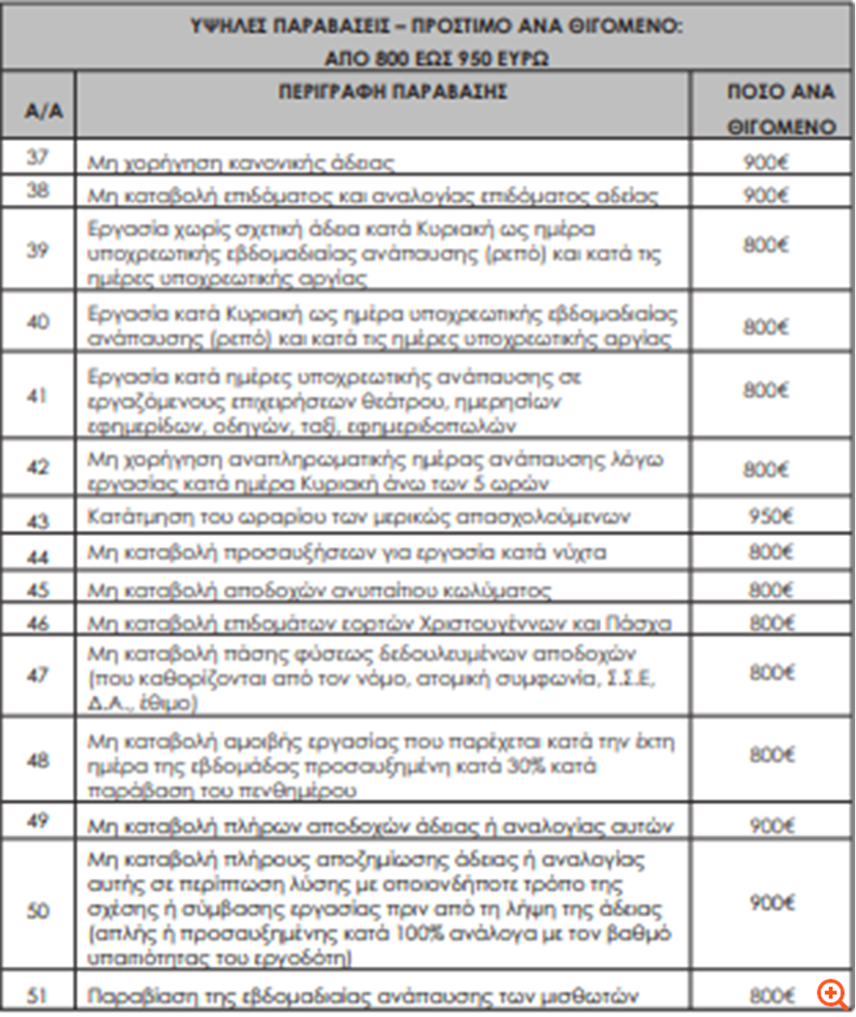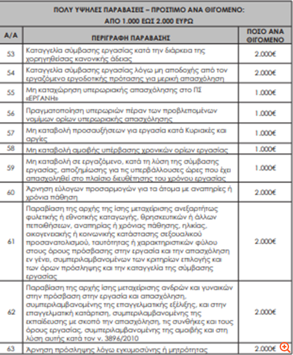 – των προστίμων ανάλογα με τη σοβαρότητα της παράβασης, τον αριθμό των εργαζομένων, την επανάληψη της παράβασης, τον αριθμό των εργαζομένων που θίγονται, το μέγεθος της επιχείρησης, το καθεστώς απασχόλησης και την υπαιτιότητα. Τα πρόστιμα κλιμακώνονται από 300 ευρώ για παραβάσεις χαμηλής σοβαρότητας από μικρές επιχειρήσεις μέχρι 8.000 ευρώ για παραβάσεις πολύ υψηλής σοβαρότητας από μεγάλες επιχειρήσεις, ποσά τα οποία αυξάνονται έως 20% σε περίπτωση υποτροπής.