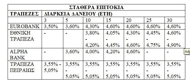 Το σταθερό επιτόκιο για 10 έτη της Εθνικής Τράπεζας διαμορφώνεται από 3,80% έως 4,20%, για 15 έτη από 4,05% έως 4,45%, για 20 έτη από 4,30% έως 4,60%, για 25 έτη από 4,45% έως 4,75% και για 30 έτη από 4,60% έως 4,90%. Στην ΕΤΕ η συνολική διάρκεια του δανείου ανέρχεται έως τα 40 έτη. Σε περίπτωση, λοιπόν, που η διάρκεια υπερβαίνει την περίοδο σταθερού επιτοκίου τότε ισχύει Euribor τριμήνου πλέον σταθερού περιθωρίου (3,30% ή 3,75%).