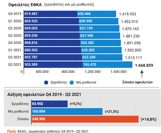 Οι εργοδότες με οφειλές στον ΕΦΚΑ ανήλθαν τον Σεπτέμβριο του 2021 στους 903.389 έναντι 819.487 που ήταν τον Δεκέμβριο του 2019. Αυτό σημαίνει πως αυξήθηκαν κατά 83.902 ή 9,2% σε διάστημα 21 μηνών.